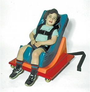 Skillbuilders Three-Piece Mobile Floor Sitter combines Feeder Seat, Floor Sitter Wedge, and Flat Mobile Base. Wedge secured to base with hook and loop fasteners. Individual may be moved without repositioning.